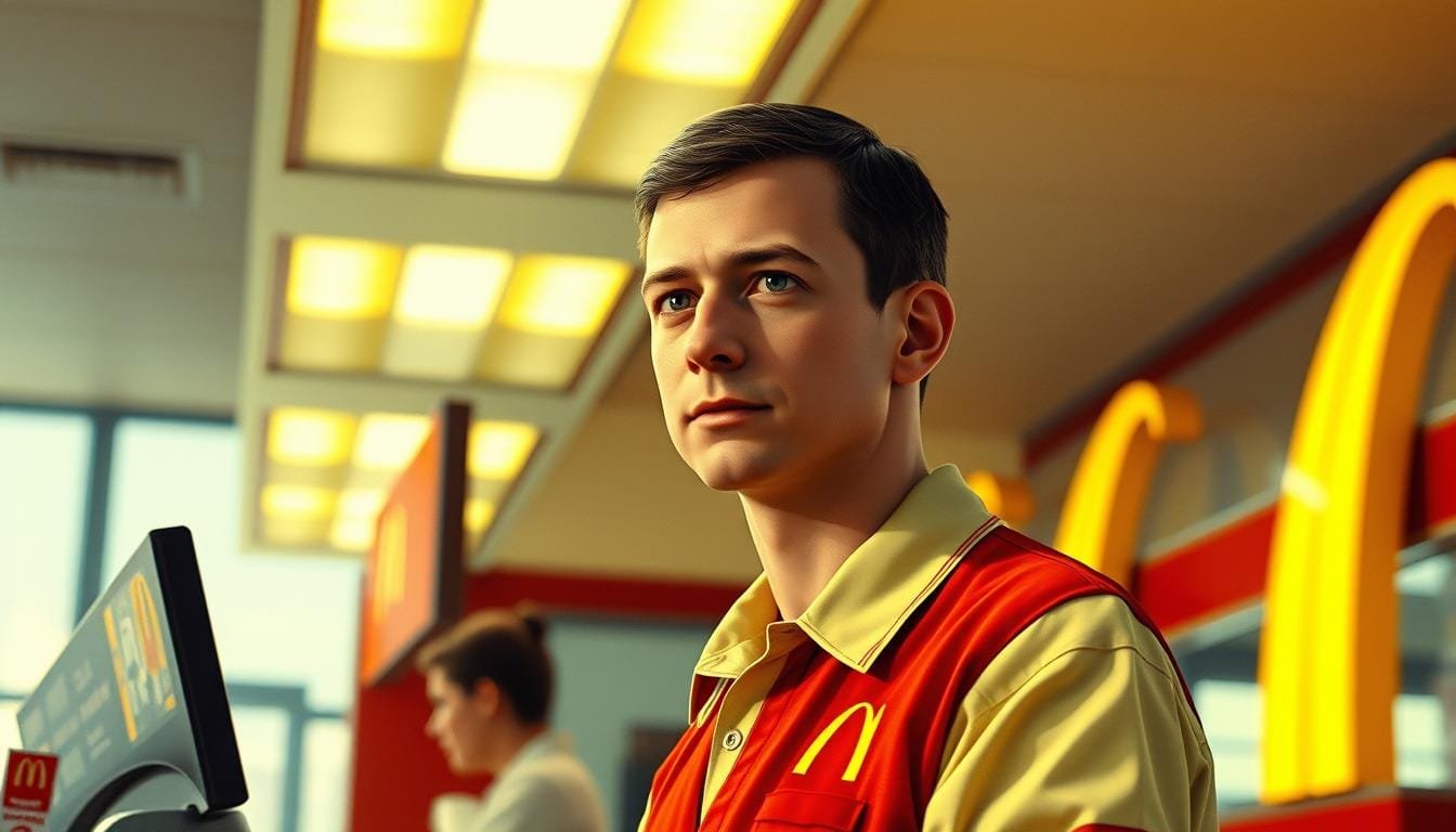 A young Jeff Bezos, clad in a crisp McDonald's uniform, stands behind the counter of a retro-style fast food restaurant. Soft morning light filters through the windows, casting a warm glow on his focused expression as he prepares a breakfast order. The gleaming chrome and vinyl surfaces of the restaurant create a nostalgic 1980s atmosphere, hinting at the humble beginnings of the future tech titan. Subtle details like the old-fashioned cash register and menu boards add authenticity to the scene. The overall mood is one of quiet determination, reflecting Bezos' early drive and ambition, even in his first job.