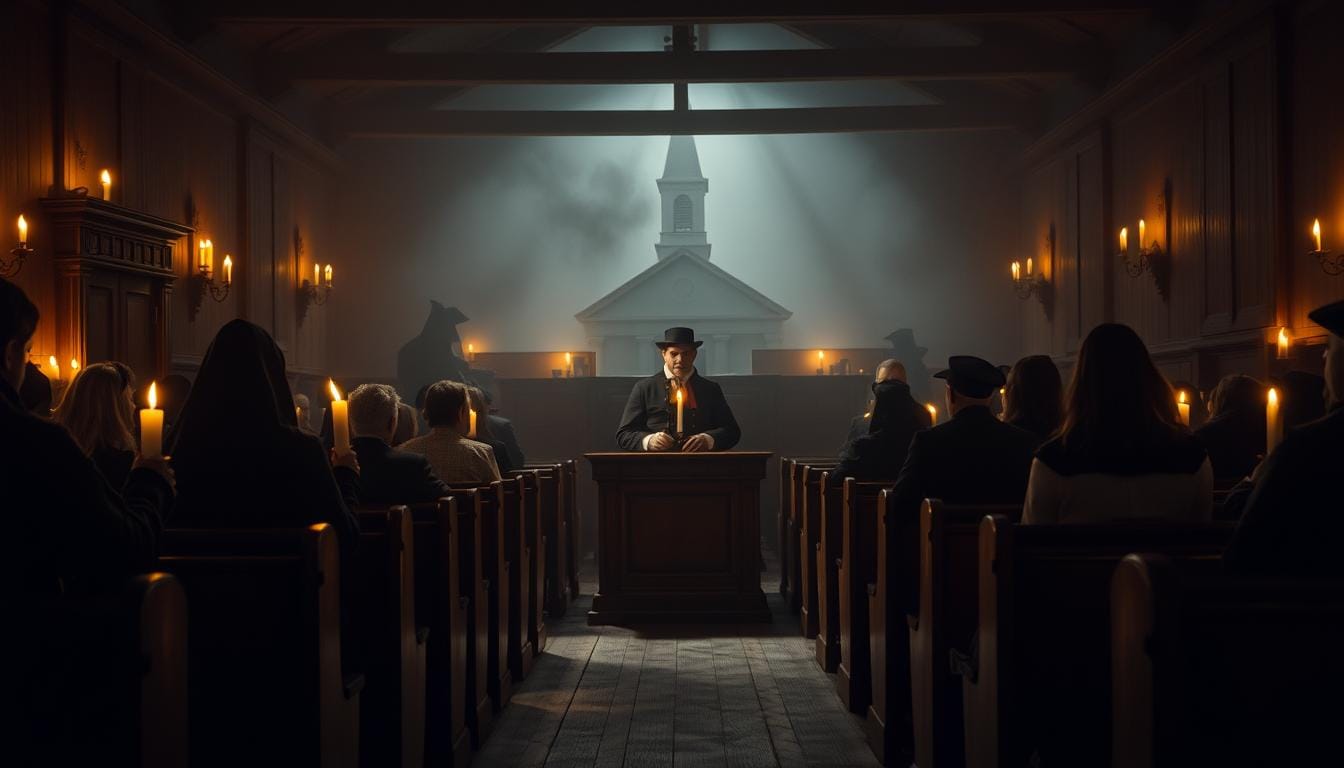 A dimly lit 17th-century church interior, with dusty pews and stained-glass windows casting a somber glow. In the pulpit, a stern-faced Puritan minister, Samuel Parris, delivers a fervent sermon, his hands gesturing emphatically as he speaks. The atmosphere is one of solemnity and religious fervor, reflecting the weight and importance of Parris's role in the Salem witch trials. The lighting is dramatic, with deep shadows and highlights that accentuate the minister's stern expression and the intensity of his delivery. The overall scene conveys the profound influence Parris wielded over his congregation and the wider community.