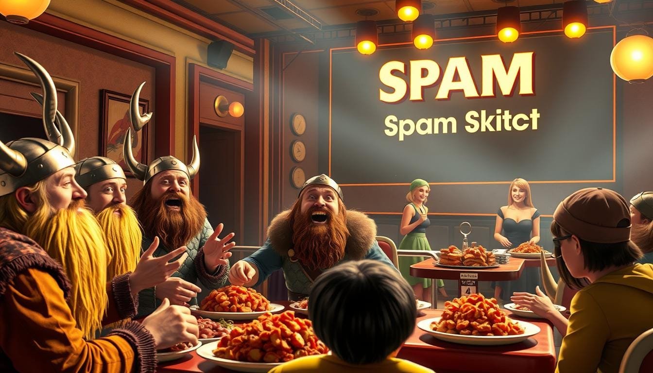 En 1970, un sketch de Monty Python mostró a una camarera que lee un menú lleno de platos con SPAM y un coro de vikingos que repite «spam, spam…». La repetición creó una sensación de saturación imposible de ignorar.
