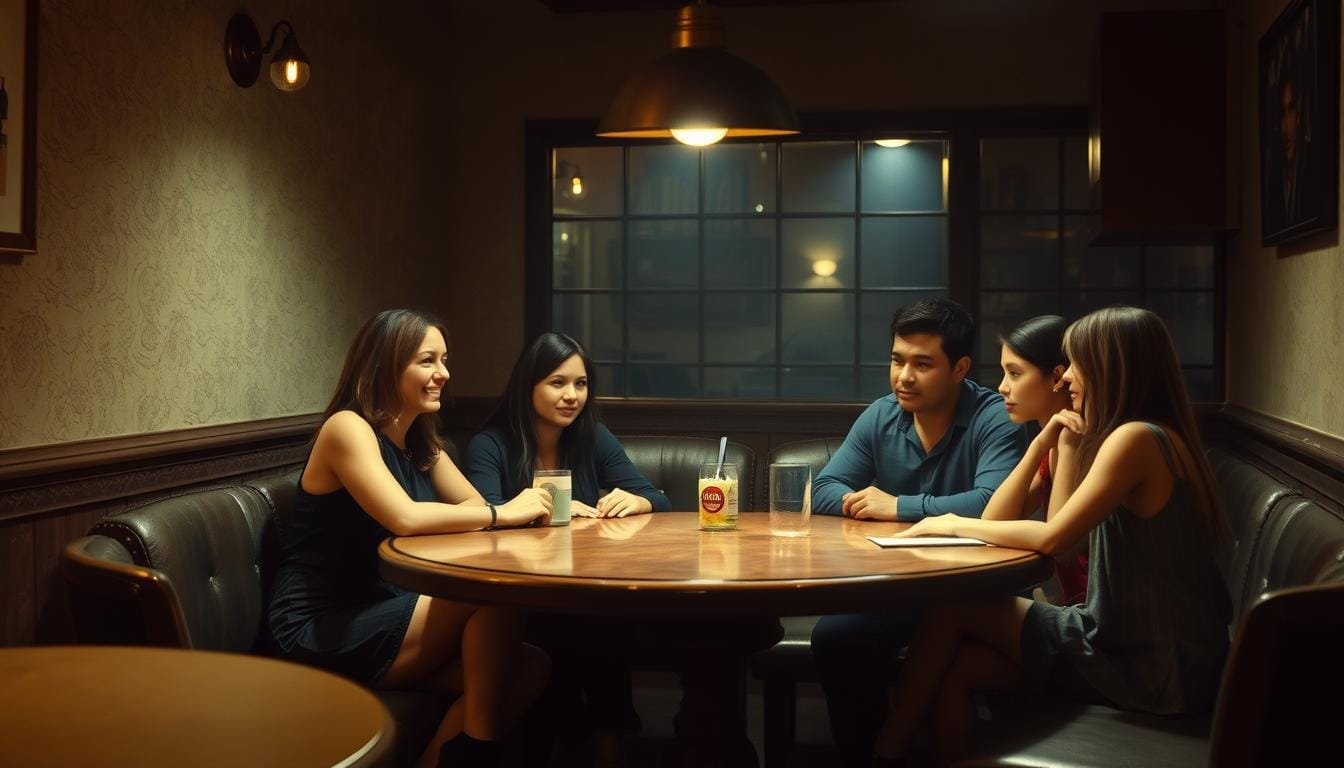 A cozy, well-lit cafe interior, with six friends seated around a large, circular table, deep in conversation. The group is diverse in age, gender, and personality, yet they share a strong bond of camaraderie. Warm lighting casts a soft glow, highlighting the vibrant expressions and animated gestures of the characters. The background is blurred, placing the focus on the group's interactions and the sense of companionship they share. The scene conveys a sense of comfort, familiarity, and the joy of spending time with close friends.