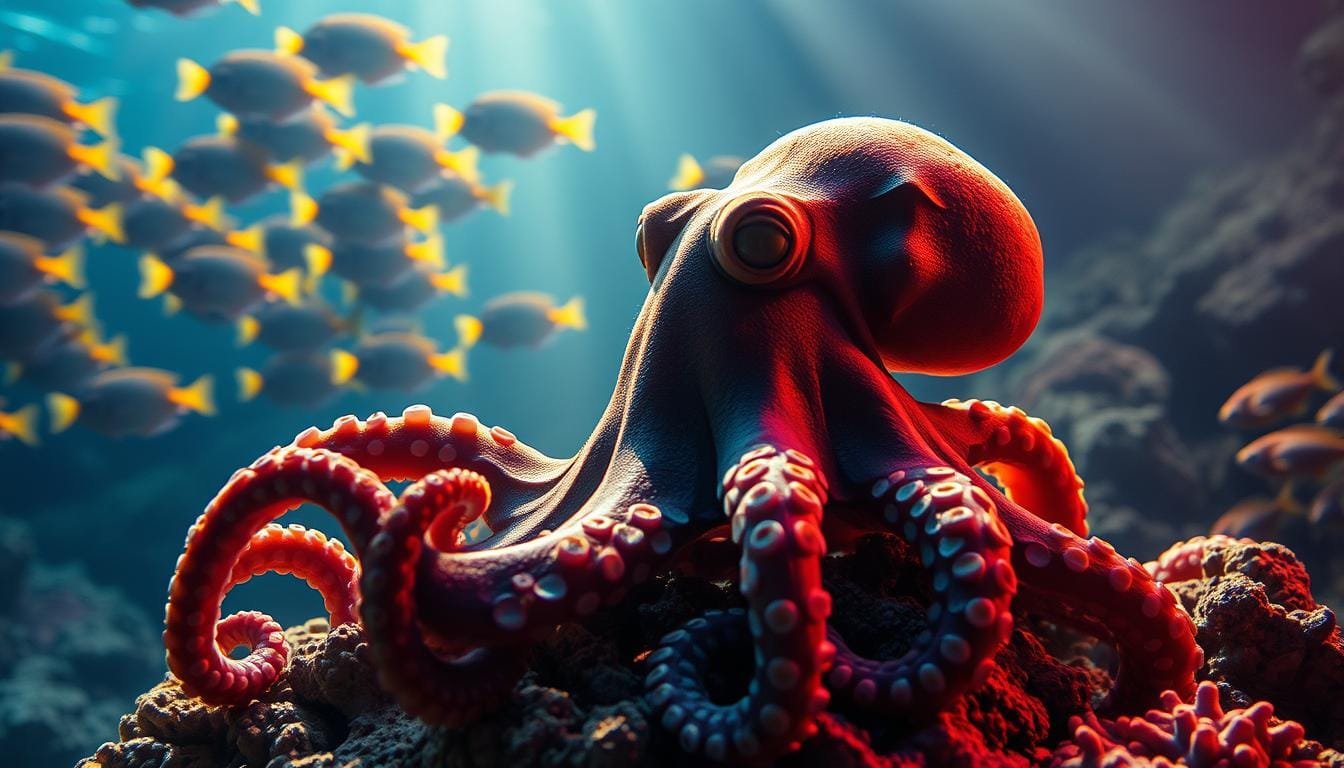 A dynamic, underwater scene showcasing the remarkable camouflage abilities of octopuses. In the foreground, a camouflaged octopus effortlessly blends into its rocky, coral-encrusted surroundings, its tentacles expertly mimicking the textures and colors of the seafloor. In the middle ground, another octopus skillfully navigates a maze-like environment, its shifting hues and patterns enabling it to evade potential predators with ease. In the distant background, a school of vibrant tropical fish dances through the shimmering, blue-green waters, creating a sense of tranquility and wonder. Subtle, natural lighting enhances the scene, casting soft shadows and highlights that accentuate the octopuses' remarkable camouflage abilities. The overall composition conveys the octopuses' exceptional intelligence, adaptability, and mastery of their aquatic domain.