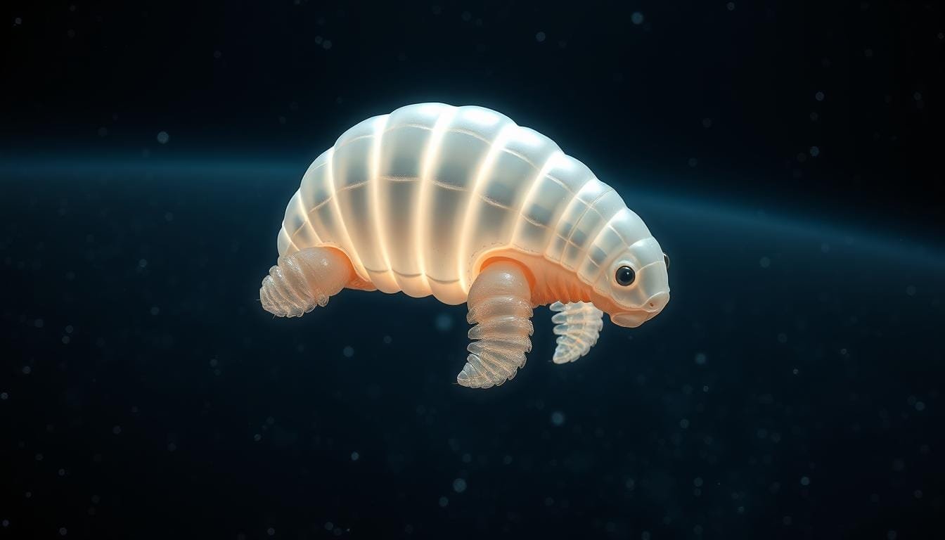 A highly detailed, microscopic view of cellular structures, focusing on the intricate and resilient proteins that protect tardigrades, also known as water bears. Crisp, high-resolution imagery showcases the complex geometry and mechanisms of these remarkable biomolecules, with a sense of awe and scientific curiosity. The scene is bathed in warm, soft lighting, creating an almost ethereal, otherworldly atmosphere that reflects the remarkable adaptability of these microscopic extremophiles. The composition guides the viewer's eye through the delicate yet robust cellular components, hinting at the hidden biological secrets that enable tardigrades to survive the harshest environments, including the vacuum of space.