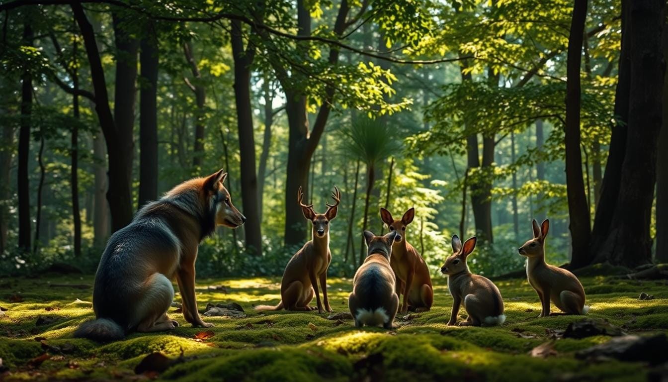 A serene outdoor scene showcasing the moral comparison between humans and animals. In the foreground, a group of diverse human figures stand tall, engrossed in intellectual discourse. In the middle ground, a pack of wild animals - lions, wolves, and deer - peacefully coexist, their gaze conveying a sense of instinctual, yet sophisticated, understanding of justice. The background depicts a lush, verdant landscape bathed in warm, golden sunlight, symbolizing the natural harmony between these two realms. The scene evokes a thoughtful, contemplative mood, inviting the viewer to ponder the nuances of moral status and the shared capacities of all sentient beings.
