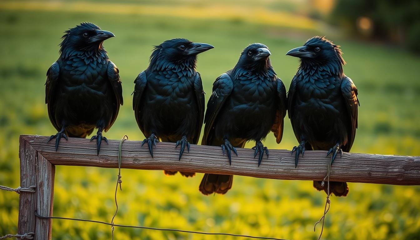 A whimsical flock of crows, their sleek black feathers glistening in the soft, warm lighting. The birds perch playfully on tree branches, their beady eyes sparkling with a hint of mischief. In the middle ground, a group of three crows engages in a lively, animated exchange, their heads tilted and wings fluttering as if sharing a humorous anecdote. The background features a lush, verdant forest, creating a serene and natural setting that complements the lighthearted mood. The overall composition conveys a sense of camaraderie and scientific curiosity, inviting the viewer to ponder the nuances of avian humor and intelligence.